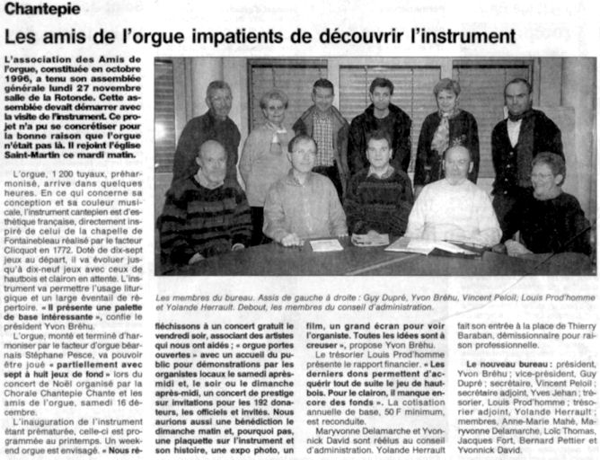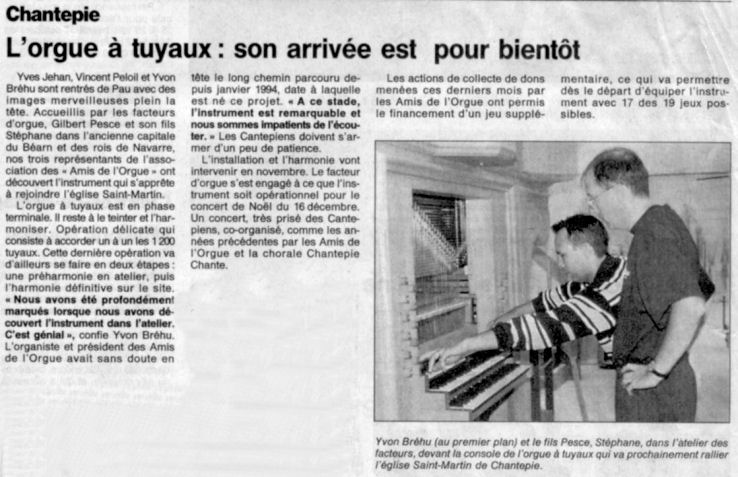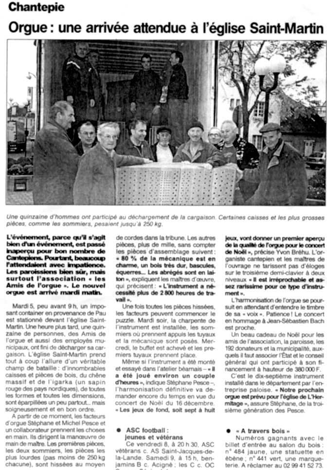 2000 Visite des ateliers Pesce à Pau Ouest France – 16 octobre 2000 Arrivée de l’orgue à Chantepie Ouest France – 5 décembre 2000 Ouest France – 8 décembre 2000 Partager cette information: