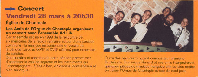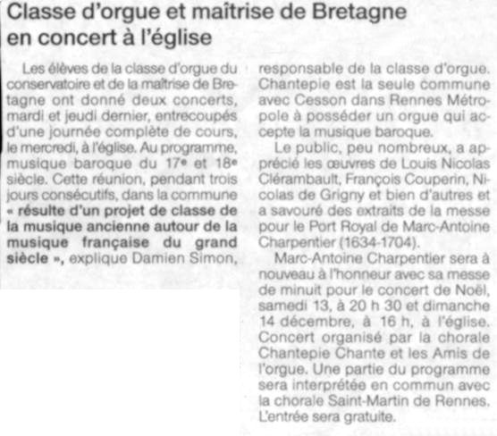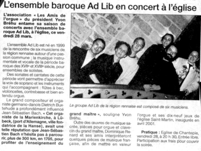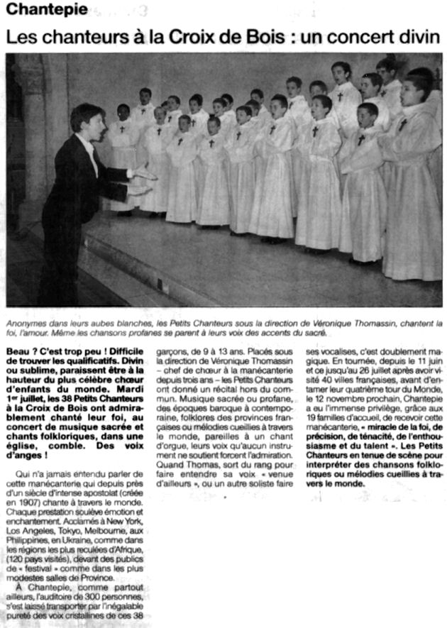 2003 Concert Ad Lib La Chanterelle n°31 (Mars 2003) Ouest France – 26 mars 2003 Les Petits Chanteurs à la Croix de Bois Ouest France – 7 juillet 2003 Concert de Noël Ouest France – 2 décembre 2003 Partager cette information: